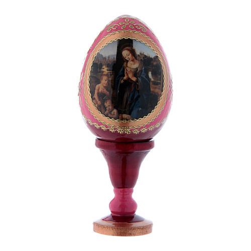 Russische Ei-Ikone, Grundfarbe: rot, Motiv: Anbetung des Kindes mit dem Johannesknaben, russisch imperial-Stil, Gesamthöhe: 13 cm (Ei: 8 cm).