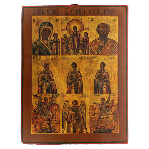 Es handelt sich um eine Familienikone für den Privatkult, die in neun Feldern unterteilt ist, jedes davon stellt eine Szene und einen Heiligen dar. In der Reihenfolge von oben links sind die Madonna von Kasan, der Abstieg in die Unterwelt, der Heilige Nikolaus, der Heilige Floro, der Heilige Pantaleon, der Heilige Laurel, der Heilige Erzengel Michael, der Schutzengel und der Heilige Georg mit dem Drachen.
