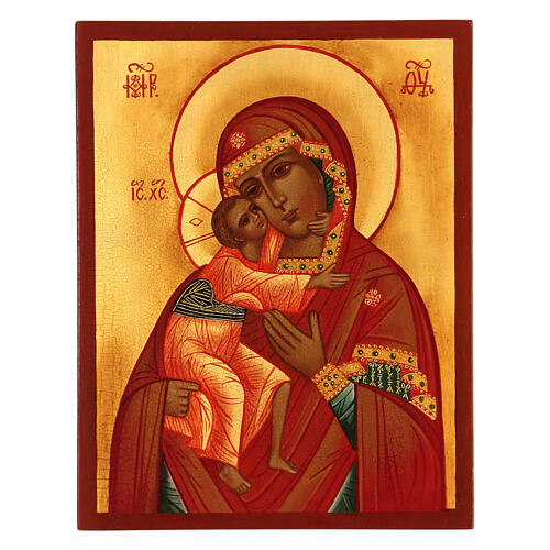 Ikone „Gottesmutter von Fjodor“ – roter Mantel, handgemalt, Russland, 14 × 10 cm