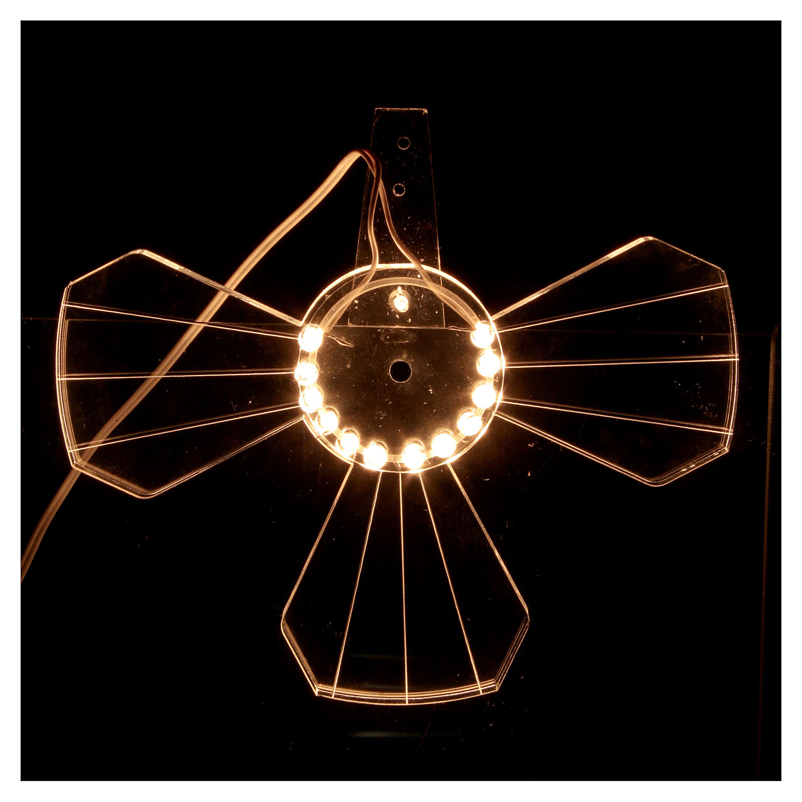 Glaenzende Heiligenschein für den Statuen der Heiligen aus transparenten Plexiglas. Sie ist Kreuz-Foermig und hat den Stromverschluss. Wegen die Lampen in der Mitte ist sie glaenzend Sie ist sehr elegant, glaenzend und komplett von italienischen Handwerken handgemacht. Sie passt zu den Statuen der Madonna.