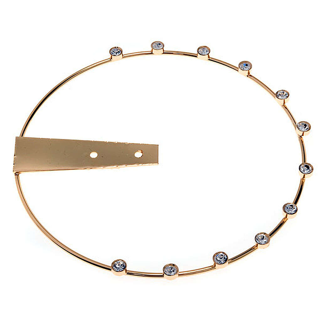 Glaenzende Heiligenschein für die kleine und groesse heilige Statue. Sie ist Gold-Farbig und hat 12 Sternen; auf die Krone sind kleinen Perlen aus transparenten Kristall und keinen Sternen. Die moegliche Groessen sind: 12, 14 und 16 Zentimeter; man kann waehlen