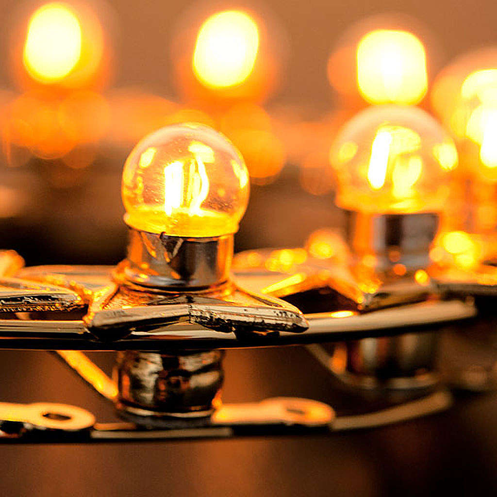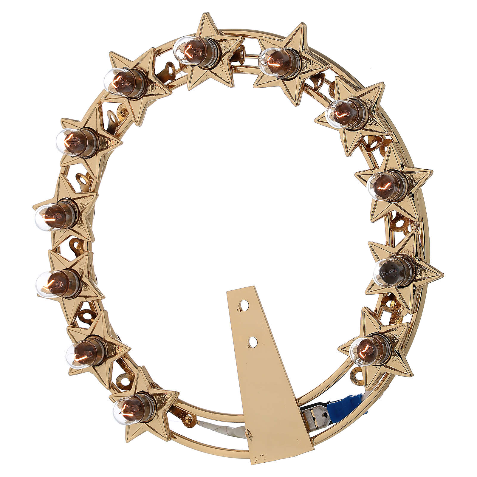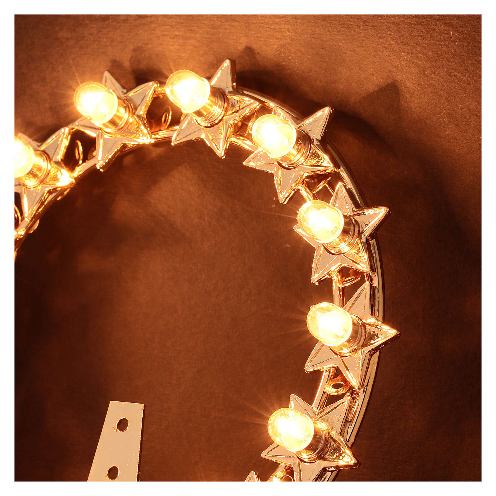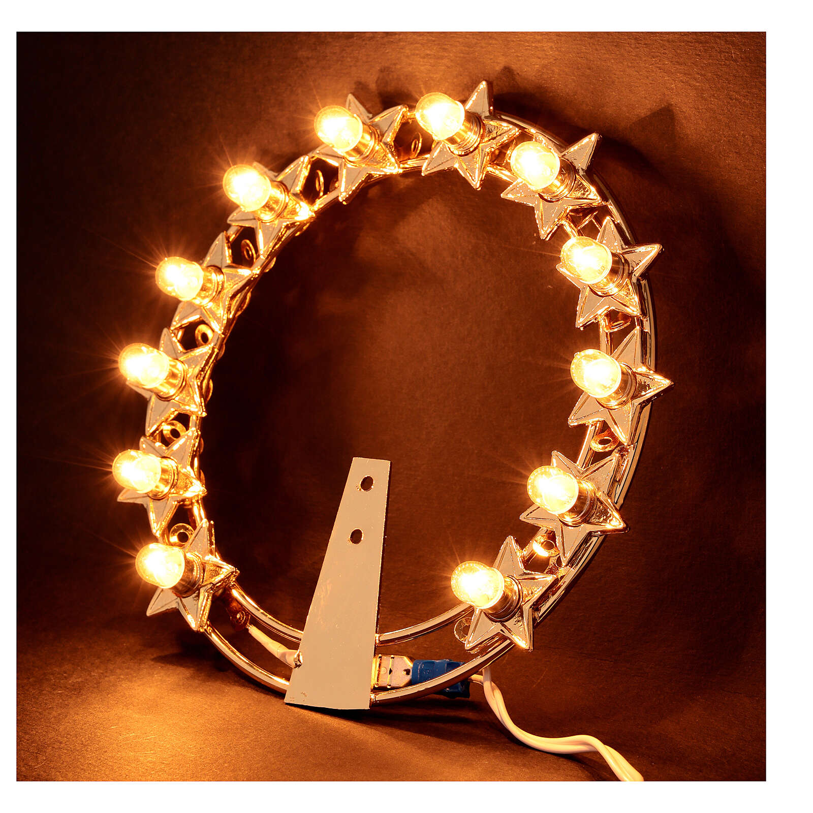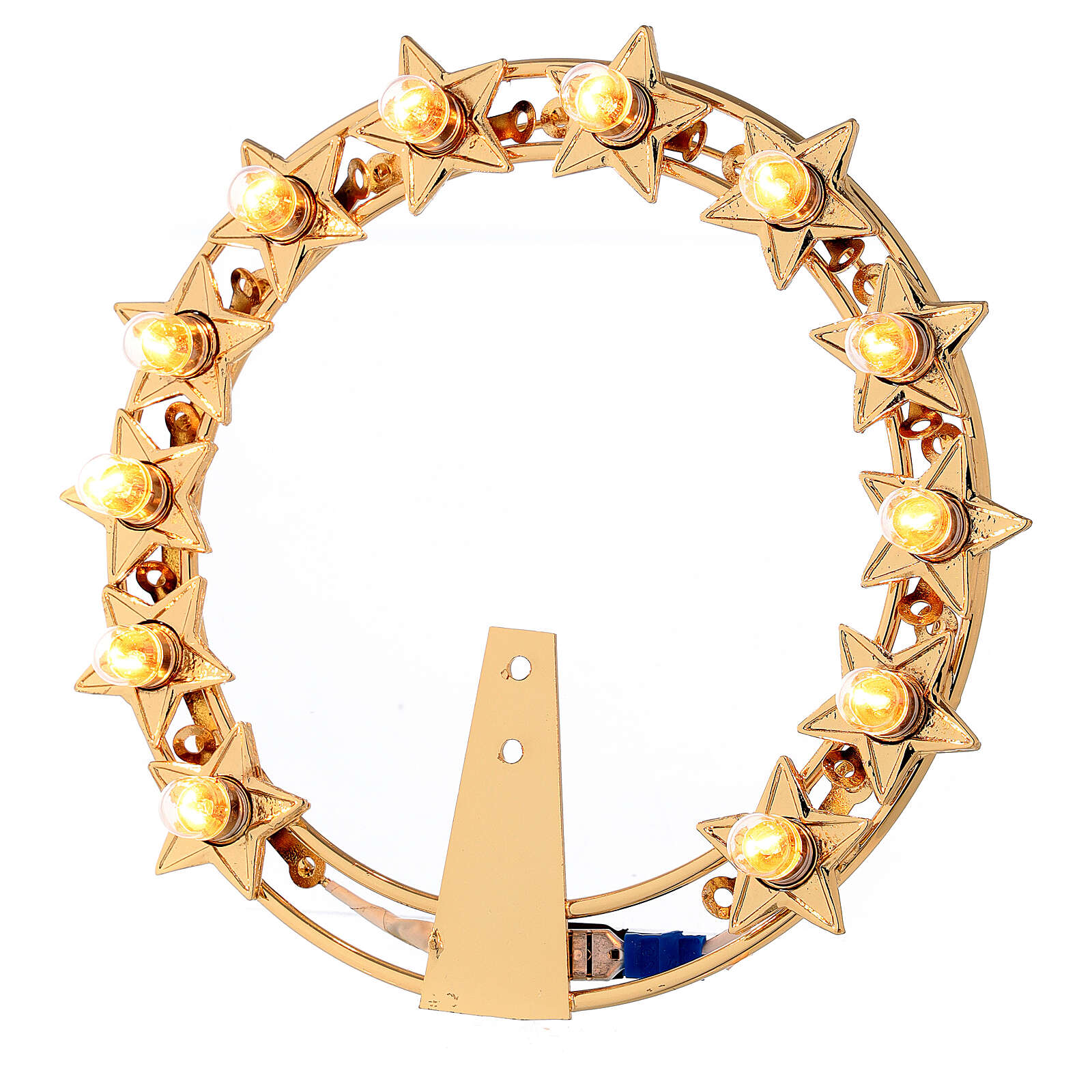 Glaenzende Heiligenschein für den Statuen der Heiligen. Sie ist aus vergoldeten Messing mit kleinen Lampen. Sie hat 12 Sternen und auf jede Sterne ist eine Lampe. Der Uebertrager von 220V bis 24V ist inklusiv. Sie ist sehr elegant, glaenzend und komplett von italienischen Handwerken handgemacht. Die moegliche Groessen sind: 12, 14 und 16 Zentimeter; man kann unten dem Bild waehlen.