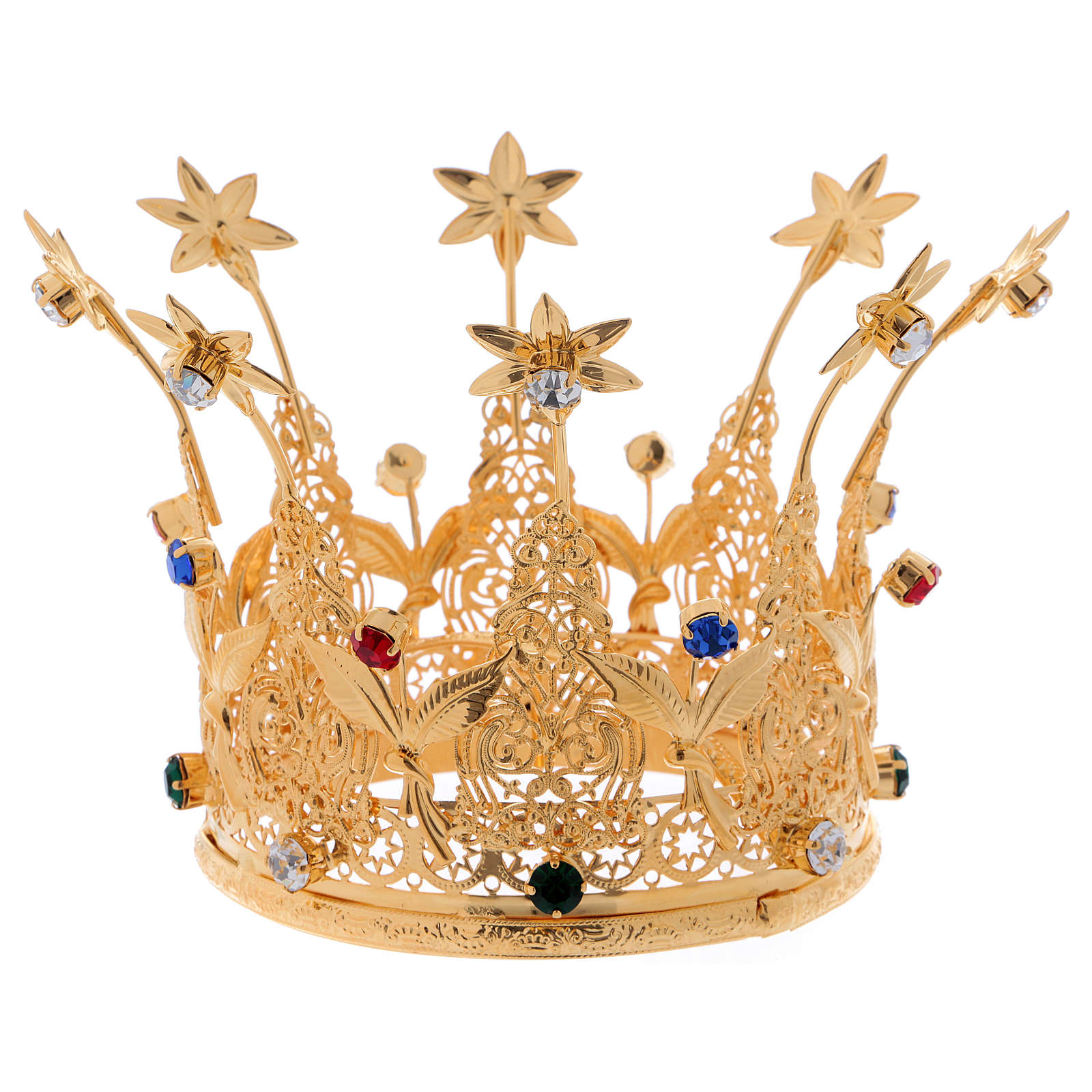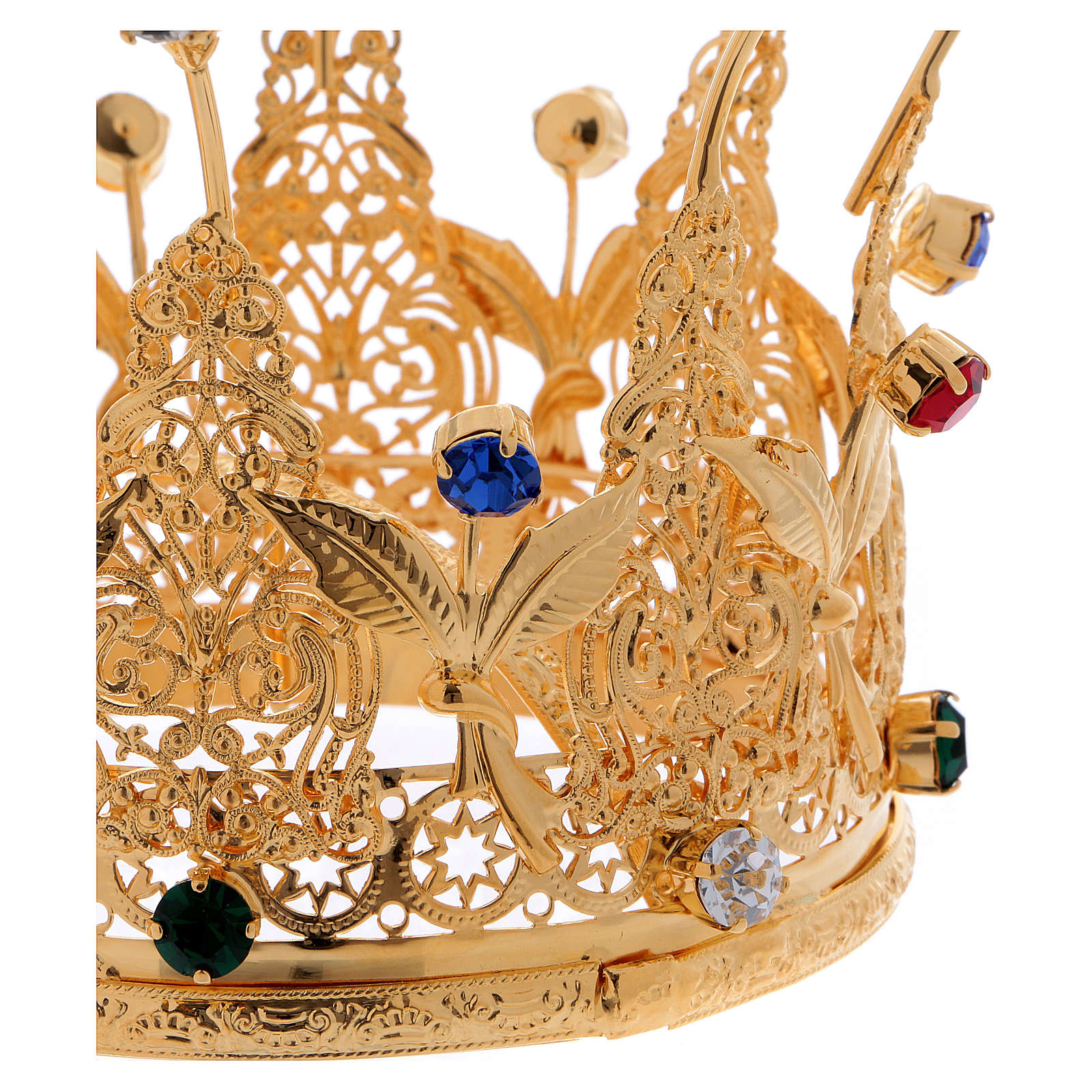 Krone für Statuen Metall Blumen und Steinen 10cm Durchmesser. Krone für Statuen realisiert aus vergoldeten Metall und verfeinert mit Blumen Dekorationen und blauen, roten und weissen Steinen.