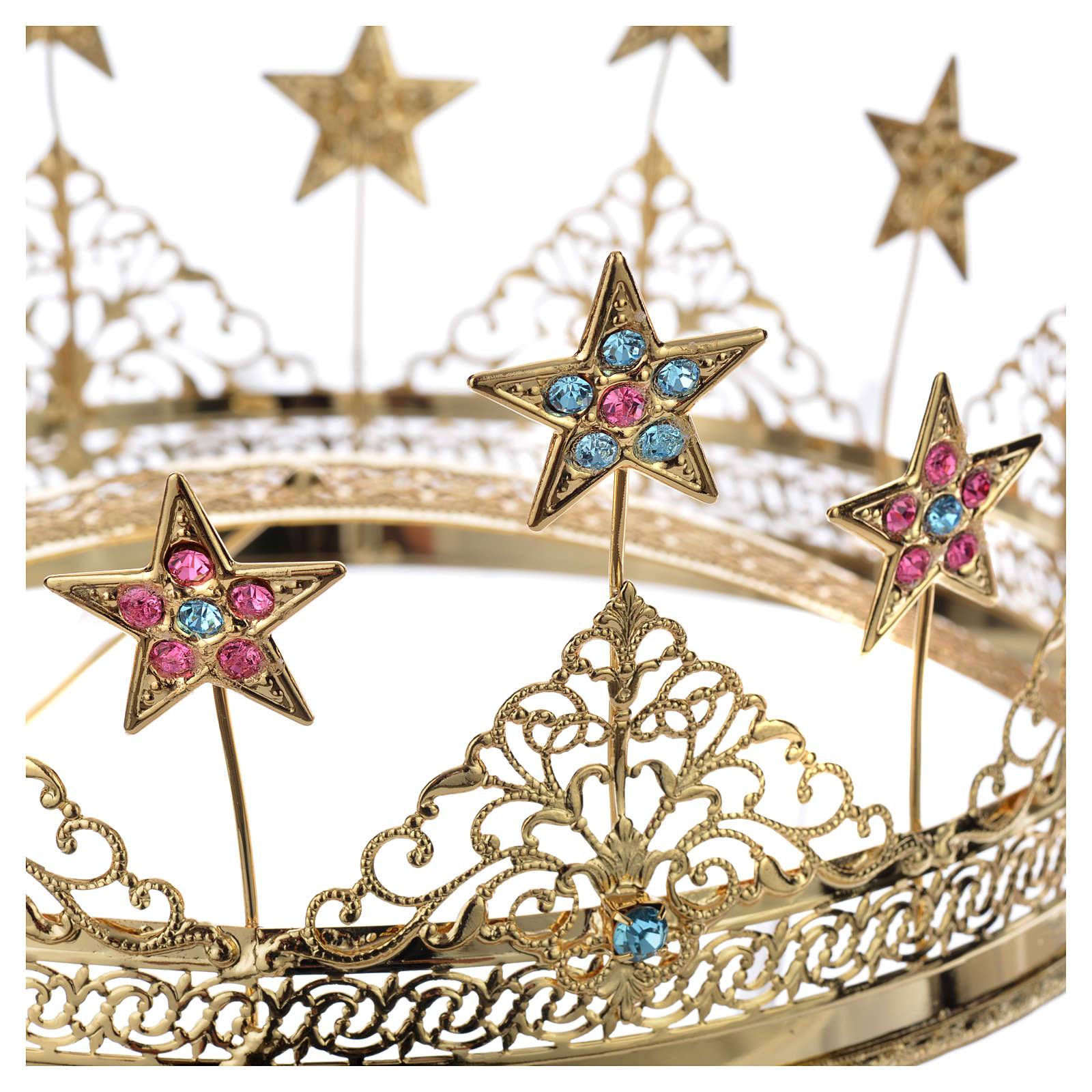 Glaenzende Heiligenschein für die kleine und groesse Statue der Madonna. Auf die Krone sind besonderen Dekorationen; Sternen und hell blauen und weissen Kristallen. Sie ist sehr elegant, glaenzend und komplett von italienischen Handwerken handgemacht. Die moegliche Groessen sind: 3, 8, 14 und 16 Zentimeter; man kann unten dem Bild waehlen.