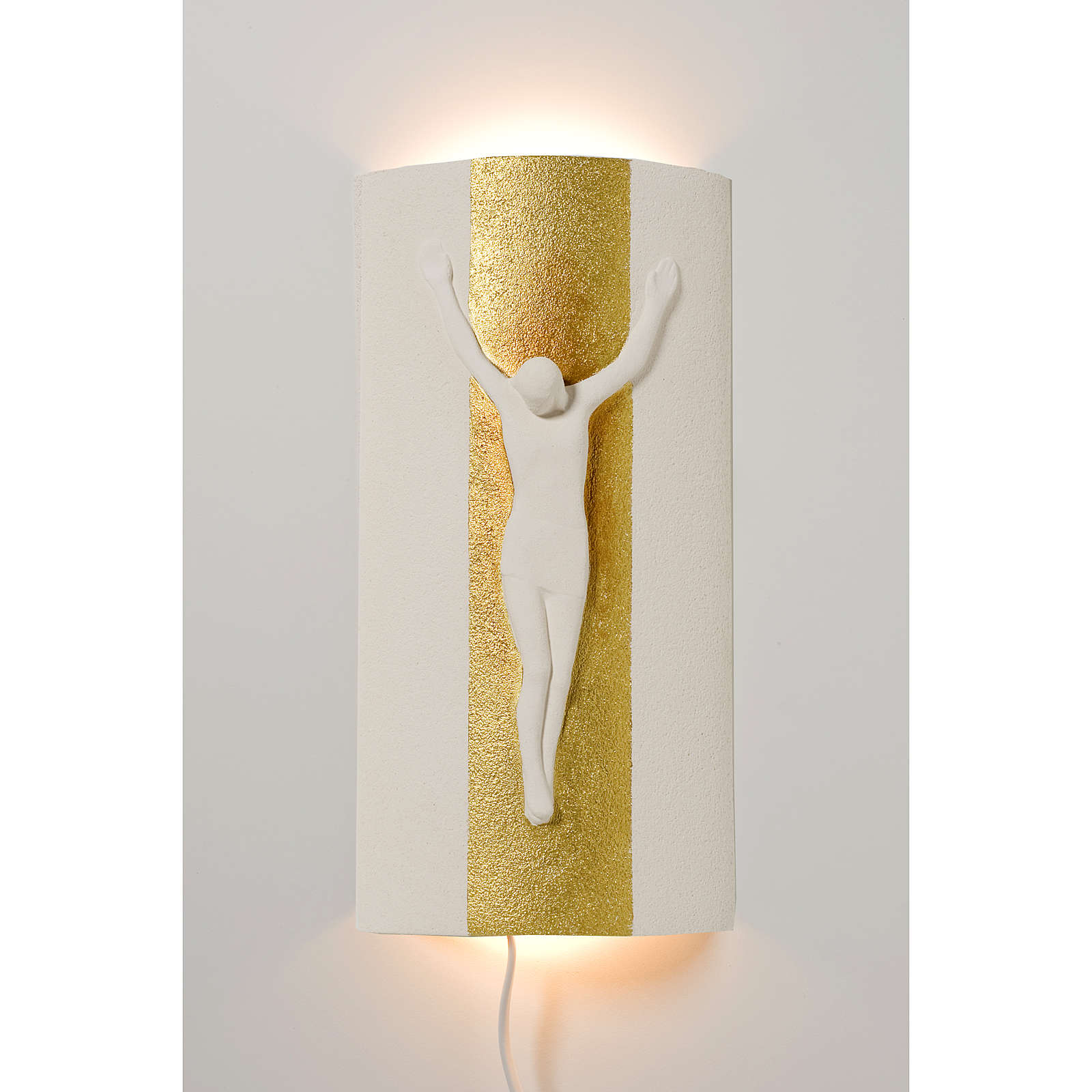 Ab sofort verfügbar Kruzifix auf Stele weissen Ton und Gold mit Licht, 17,5cm. Der Ton wird zuerst handgearbeitet und dann bei über 1000°C gebrannt. Hochwertiges Produkt, realisiert bei Centro Ceramiche in Loppiano (Florenz).