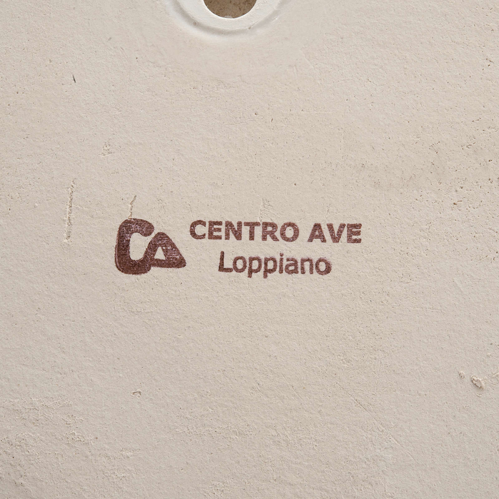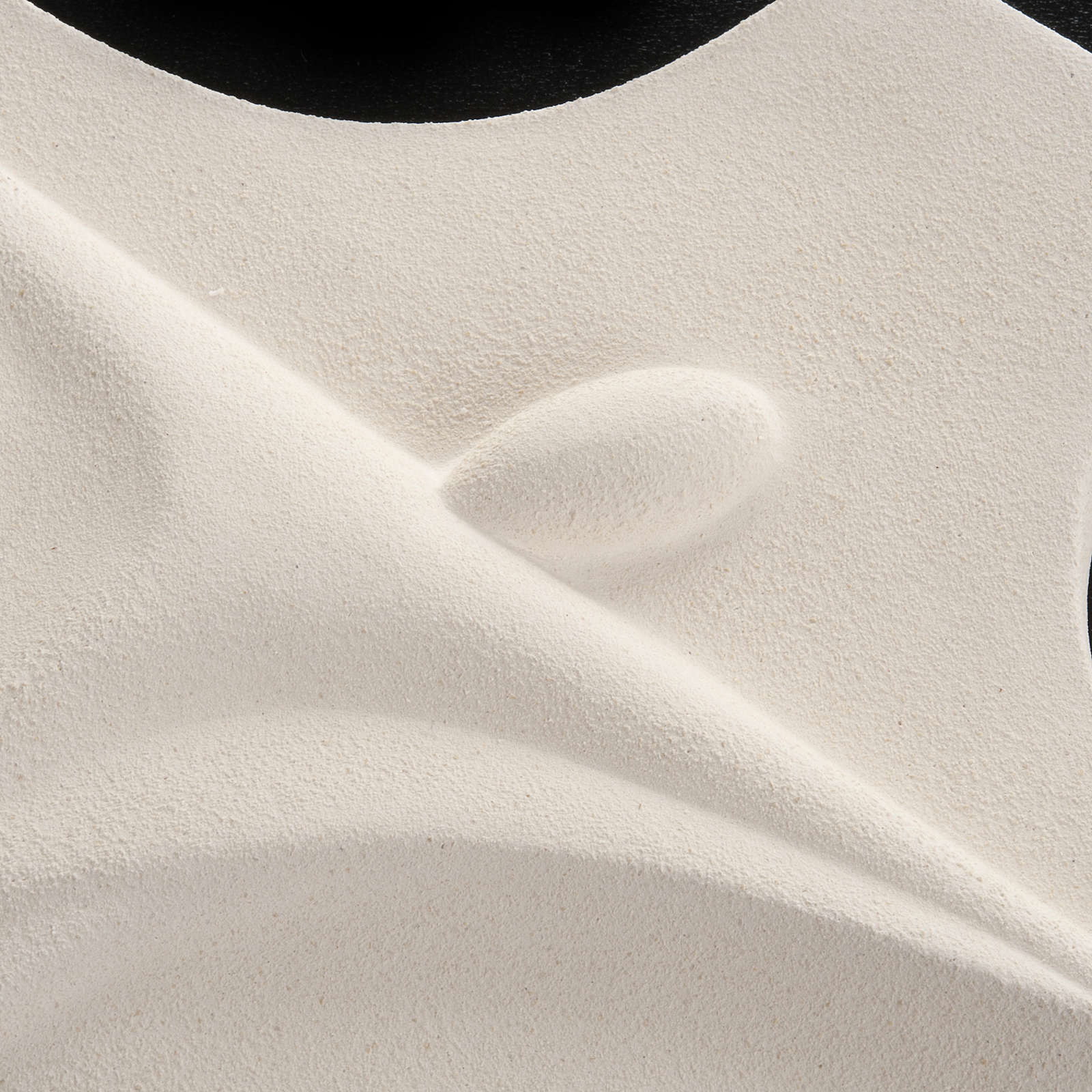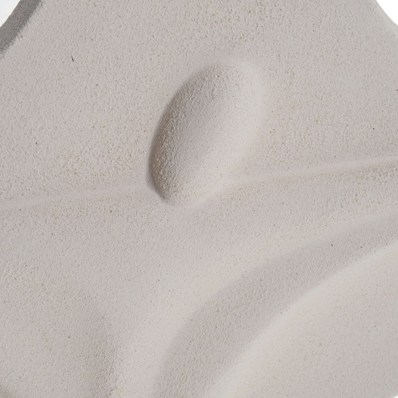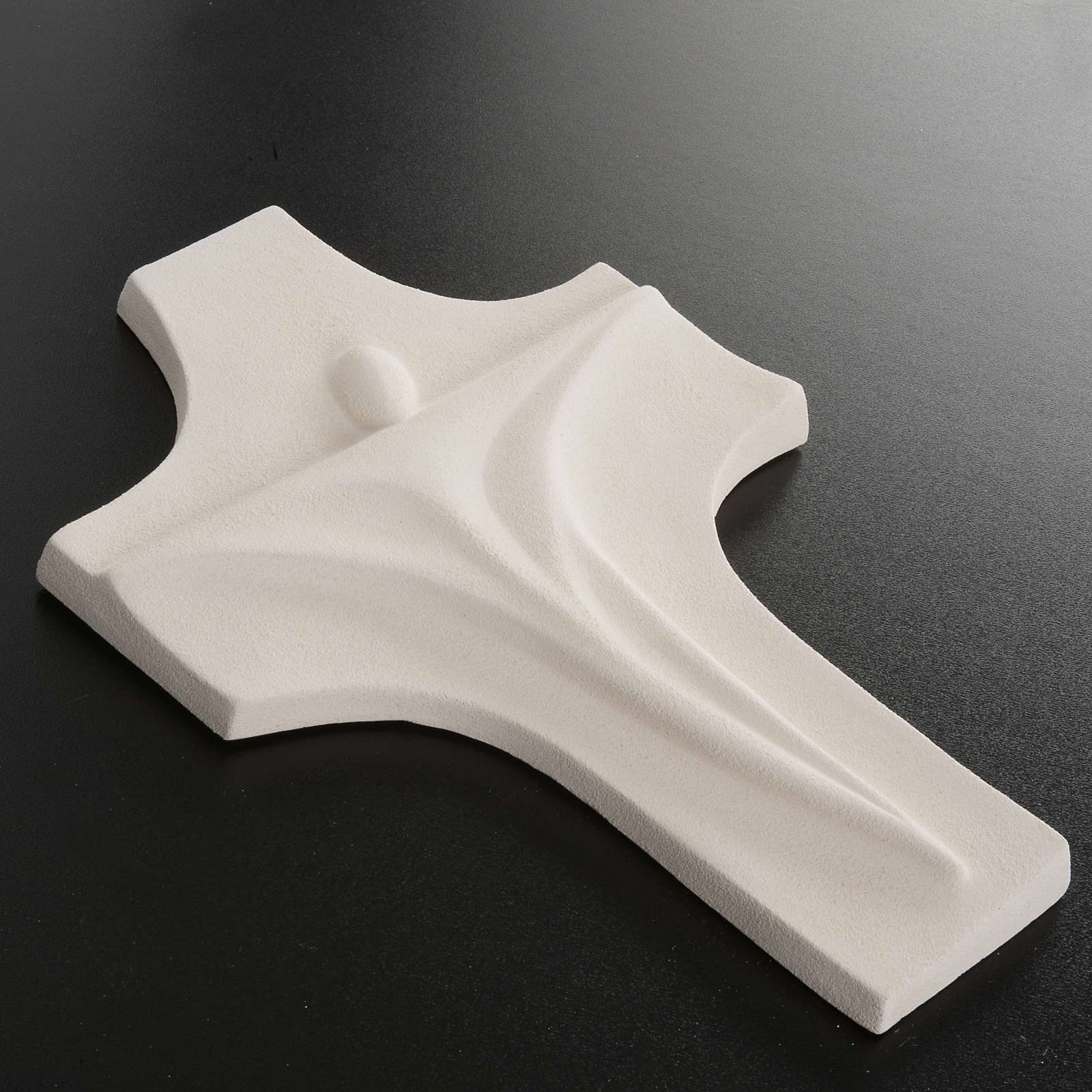 Stilisierter auferstandener Christus auf Kreuz weissen Ton. Beide auferstandener Christus und das Kreuz sind aus weissen Ton. Der Ton wird zuerst handgearbeitet und dann bei über 1000°C gebrannt. Hochwertiges Produkt, realisiert bei Centro Ceramiche in Loppiano (Florenz).