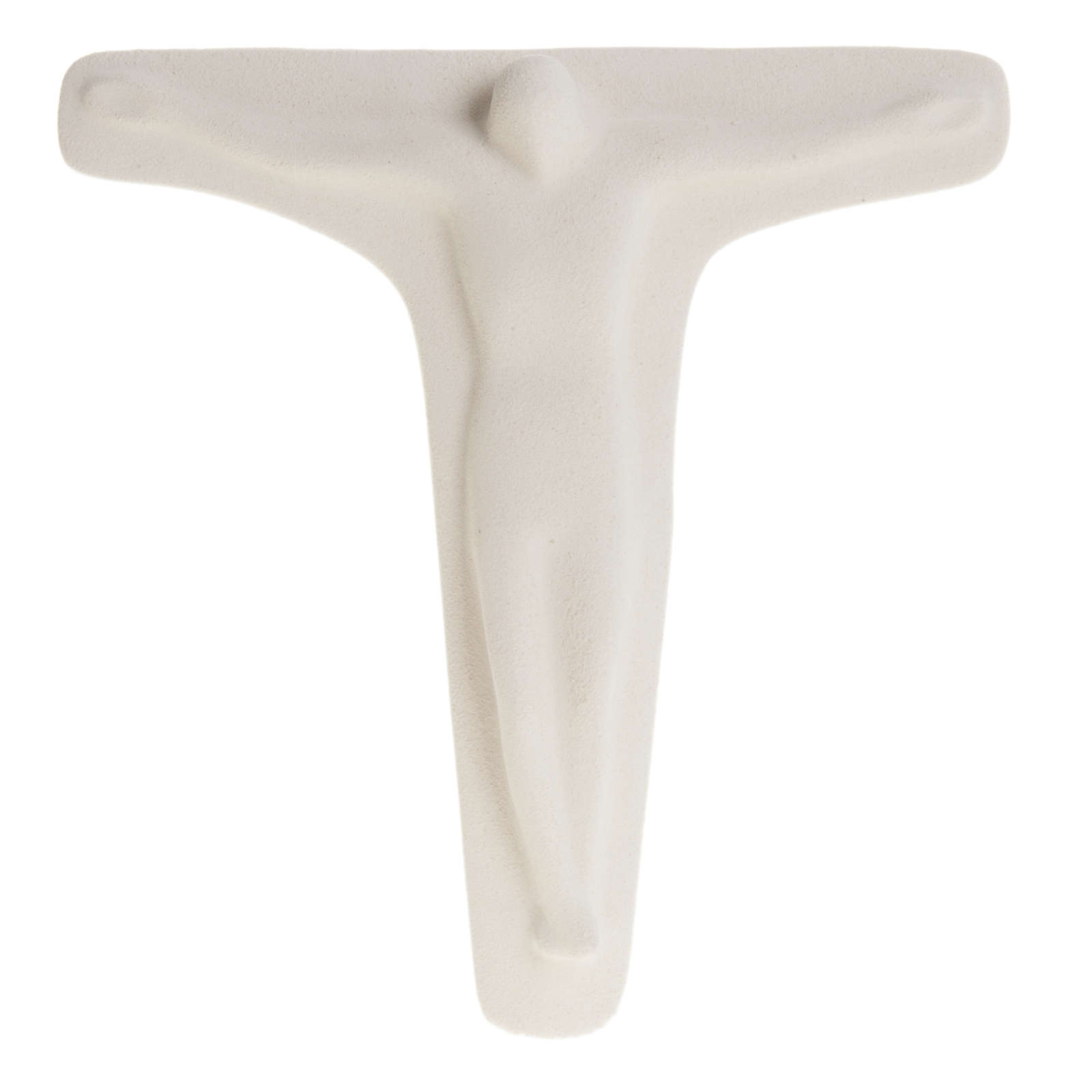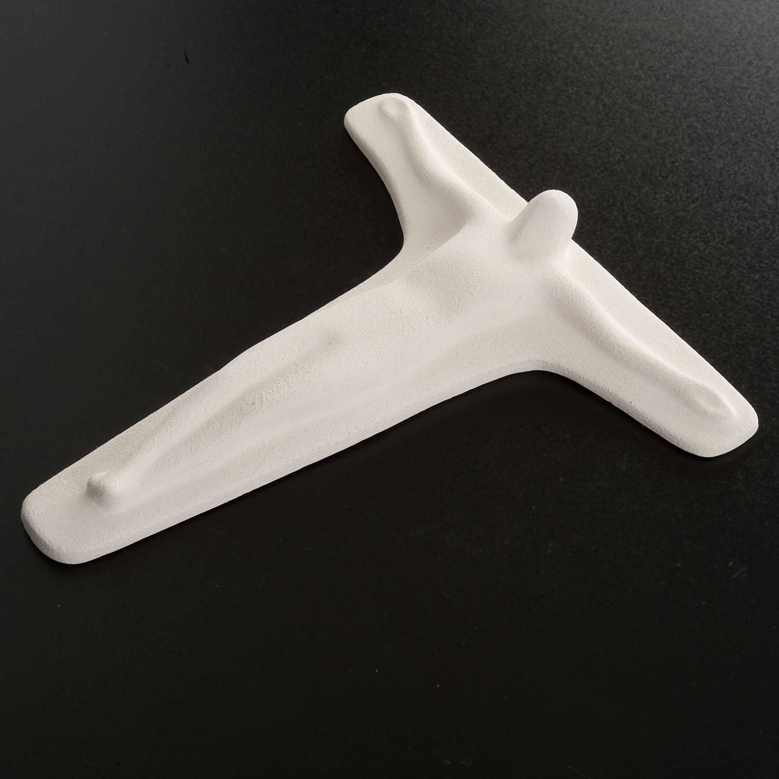 Tau Kruzifix aus weissen Ton, 17cm. Der stilisierte Leib Christi ist auf einem Tau Kreuz, und beide sind aus weissen Ton. Der Ton wird zuerst handgearbeitet und dann bei über 1000°C gebrannt. Hochwertiges Produkt, realisiert bei Centro Ceramiche in Loppiano (Florenz).