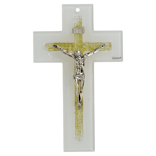 Murano Glas Wandkruzifix, handgefertigt in Italien. Das klassisch gestaltete Kruzifix hat einen silbernen Christuskörper und ruht auf einer doppelten Glasbasis mit goldenem Glitzer.