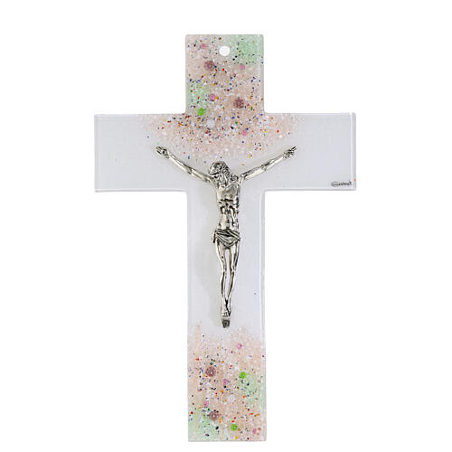 Das Kreuz ist aus Murano-Glas und versilbertem Zink hergestellt. Es hat eine raue Oberfläche und ist oben und unten mit rosa Steinen verziert. Die Jesusfigur besteht aus versilbertem Zink.