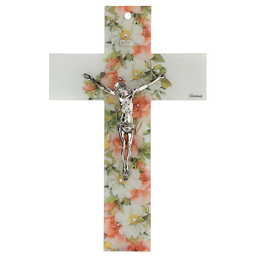 Das Kruzifix wird aus originalem Murano-Glas gefertigt. Das Kreuz zeichnet sich durch einen floralen Hintergrund aus und ist mit erhabenen Steinelementen verziert. Die Christusfigur und die INRI-Inschrift sind aus versilbertem Zamak gearbeitet.