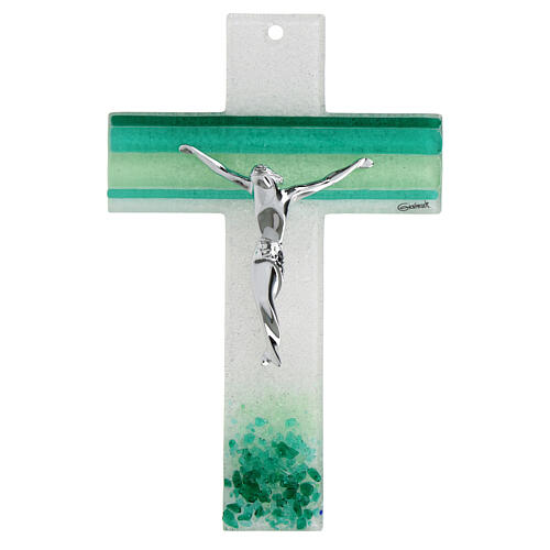 Kruzifix aus Murano-Glas mit grünen Farbschattierungen und Korpus Christi silberfarben