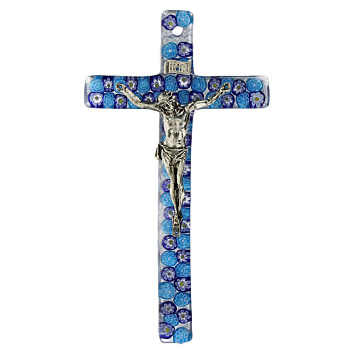 Kruzifix aus Murano Glas mit klassischen blauen Murrine, 16x8 cm.