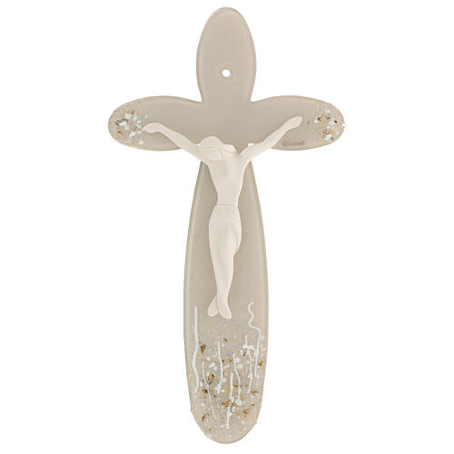 Kruzifix aus Muranoglas in taubengrauer Farbe mit reliefartigen Steinen und Blasen, Jesus aus Harz, Maße 25x14 cm.