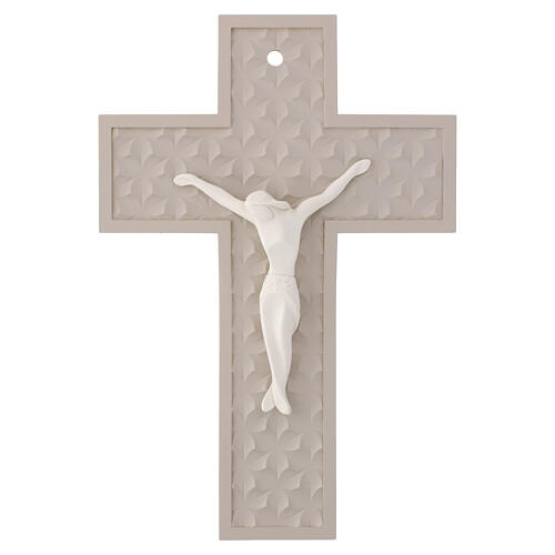 Wandkruzifix aus Resin mit floral strukturiertem Hintergrund und stilisierter Christusfigur. Die zentrale Fläche ist durch ein wiederholtes florales Relief geprägt und wird von einem glatten, erhabenen Rand eingefasst.