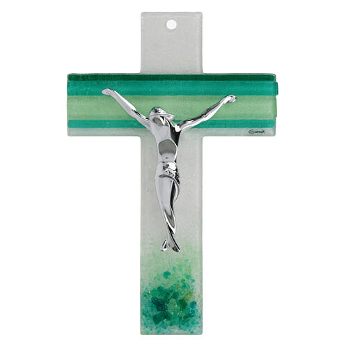 Kruzifix aus weißem Murano-Glas mit grünen Linien und Korpus Christi silberfarben