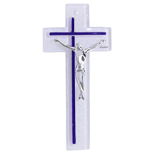 Kruzifix aus zweifarbigem Glas mit modernem, silberfarbenem Korpus, mit den Maßen 21 × 10 cm.