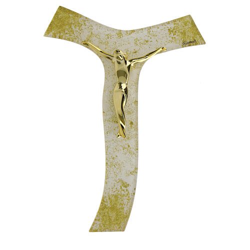 Kruzifix in Tauform aus Murano-Glas mit Korpus Christi goldfarben und Glitter 21 × 15 cm