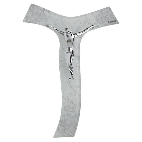 Wandkruzifix in Tauform, gefertigt aus Murano-Glas mit weißem Grund und silberfarbenen Glitterdekoren. Der Korpus Christi ist modern stilisiert ausgeführt und besitzt eine glänzend silberfarbene Oberfläche.