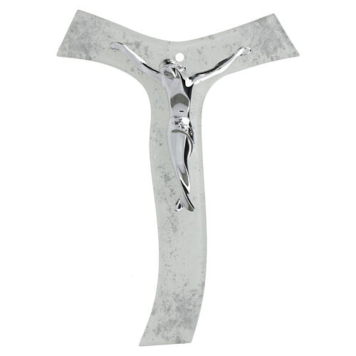 Wandkruzifix in Tauform, in Weiß gehalten und mit silberfarbenem Glitter dekoriert. In der Mitte ist der Korpus Christi angebracht, modern stilisiert und mit glänzend silberfarbener Oberfläche ausgeführt.