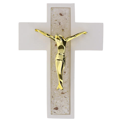 Kruzifix zur Wandaufhängung mit weißer Resinoberfläche in Holzdekor-Optik, vertikalem Einsatz aus Murano-Glas und goldfarben ausgeführtem Korpus, mit den Gesamtmaßen von 13,5 × 10 cm.