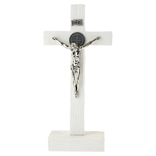 Tischkruzifix mit Benediktusmedaille aus weißem Resin, mit den Gesamtmaßen von 23 × 10,5 cm.