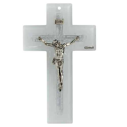 Weißes Kruzifix mit Silberglitter aus Muranoglas 16x9,5 cm.