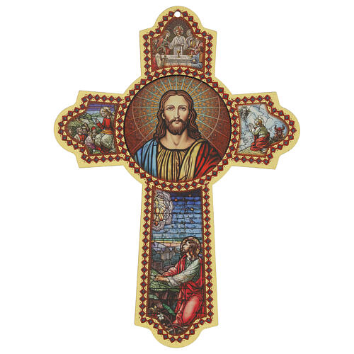 Sein zeitloses und elegantes Design passt perfekt in jeden Raum, sei es privat oder religiös. Es zeigt Darstellungen bedeutsamer Episoden aus dem Leben Christi, jeweils eingerahmt von einem zarten geometrischen Muster mit kleinen roten Rauten.