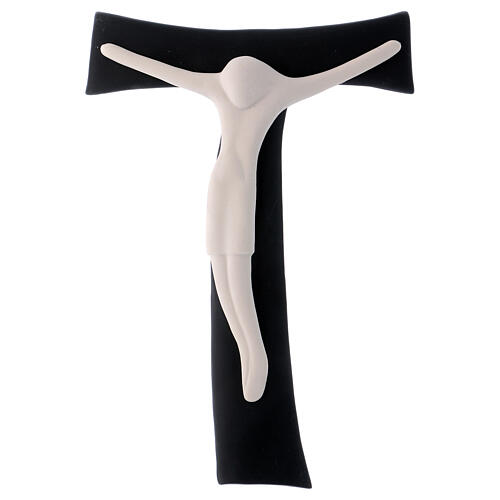 Der Korpus Christi ist aus weißem Porzellan gefertigt, das Taukreuz aus einer edlen, dauerhaft dunkelgrauen Porzellanmasse. Das Kreuz ist abwaschbar.