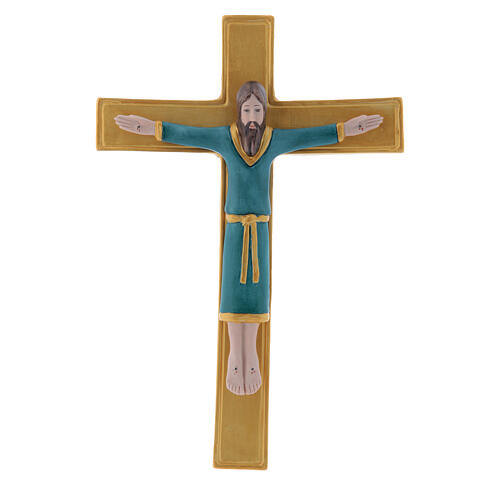 Elegantes, farbiges Flachrelief von Pinton, das den Leib Christi mit blauer Tunika am Kreuz darstellt.