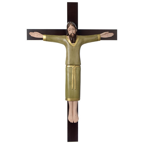 Der Körper und das Gesicht Jesu sind farbig gestaltet, er trägt eine grüne Tunika mit goldener Verzierung. Das Motiv ist aus farbigem Porzellan gefertigt, das sich vom dunklen Mahagoniholz abhebt, einem in der Regel rotbraunen Material. Maße: 65x42 cm. Das Werk wurde in Italien von dem Künstler Francesco Pinton hergestellt.