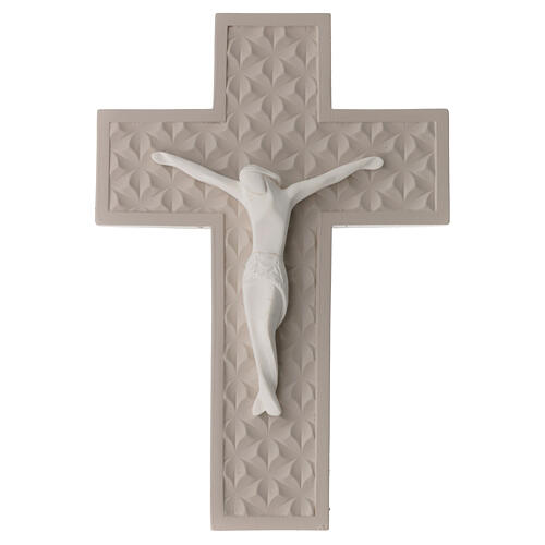 Tischkruzifix aus Kunstharz, geometrisches Dekor, taupefarben – 13 × 9 cm