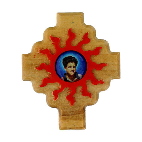 Kreuzmagnet aus Olivenholz mit roten Strahlen Carlo Acutis 3x3,5 cm