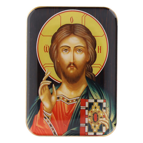Holzmagnet mit der Darstellung von Christus Pantokrator als Brustbild.