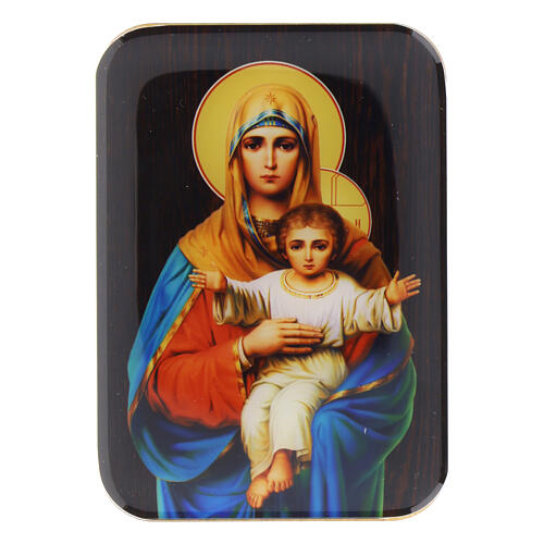 Holzmagnet mit der Darstellung der Gottesmutter „Gnadenreicher Himmel“ mit dem Jesuskind im Arm.