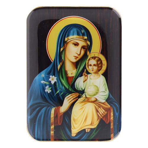 Holzmagnet mit der Darstellung der Gottesmutter „Unverwelkliche Blume“ mit dem Jesuskind.