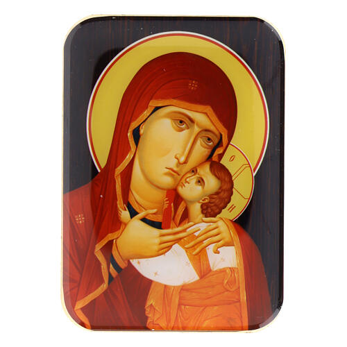 Holzmagnet mit der Darstellung der Gottesmutter von Kasperov mit dem Jesuskind.