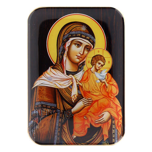 Holzmagnet mit der Darstellung der Gottesmutter von Konevets mit dem Jesuskind im Arm.