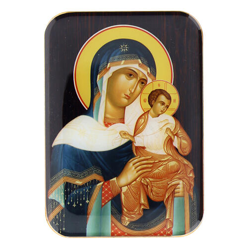 Holzmagnet mit der Darstellung der Gottesmutter von Konevets im Arm mit dem Jesuskind.