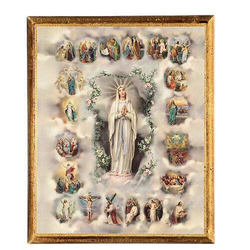 Dekorative Tafel mit fein geformten Rand aus Pappelholz, die die Geheimnisse des Rosenkranzes darstellt. Im Zentrum befindet sich das Bild der Gottesmutter von Lourdes.