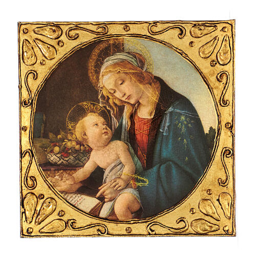 Bild der Madonna mit Buch nach Botticelli, gedruckt auf eine quadratische Holztafel aus Pappelholz (30 x 30 cm). Der hochwertige, hochauflösende Druck ist auf den Holzgrund aufgebracht und mit Imitat-Goldfolie sowie weißem Email veredelt. Abschließend wird die Oberfläche mit einem transparenten Schutzlack versiegelt.