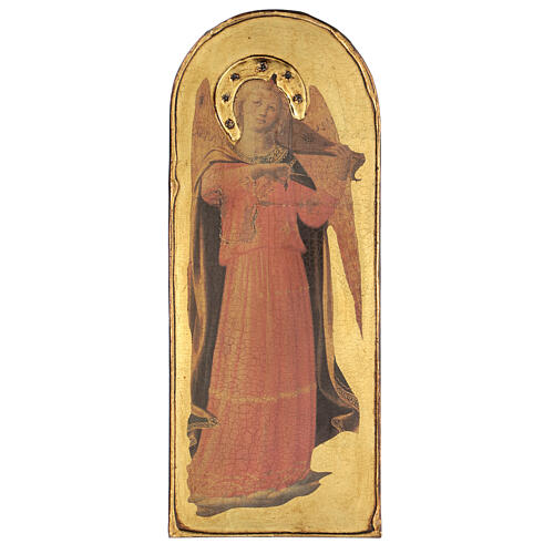 Es handelt sich um einen hochauflösenden Druck auf einer Tafel aus Pappelholz mit Rundbogenabschluss, der auf einen Holzrahmen aufgebracht und mit erhabenen Verzierungen, einem Antikeffekt und Imitationsvergoldung veredelt ist. Die Tafel wird mit einer transparenten Schutzlackierung versehen.