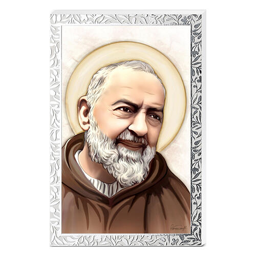 Dekoratives Bild auf weißem Holz mit einer farbigen Darstellung des heiligen Pio. Das lebendige Antlitz wird durch glänzende, reliefartige Details hervorgehoben. Ein kunstvoll verzierter Rahmen mit silberfarbenen Zweigen und Blättern rundet das Motiv stilvoll ab.