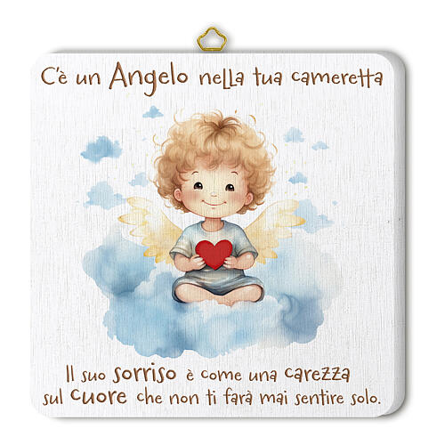 Kleines Bild, Engel mit Herz – auf Tafel gedruckt mit italienischer Inschrift, 20 x 20 cm