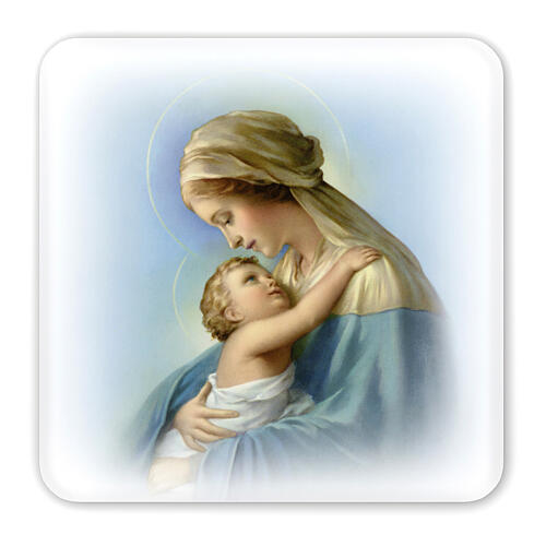 Dieses fein gestaltete Bild zeigt die Gottesmutter mit dem Jesuskind in einem innigen Blickkontakt – eine Darstellung voller Zärtlichkeit und spiritueller Tiefe. Die abgerundeten Ecken sorgen für eine elegante, sichere Form, ideal für jede Wohnumgebung.