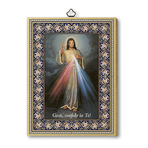 Holzbild mit dem Motiv des Barmherzigen Jesus. Zu seinen Füßen steht der italienische Schriftzug „Gesù, confido in Te!“ – „Jesus, ich vertraue auf dich!“.