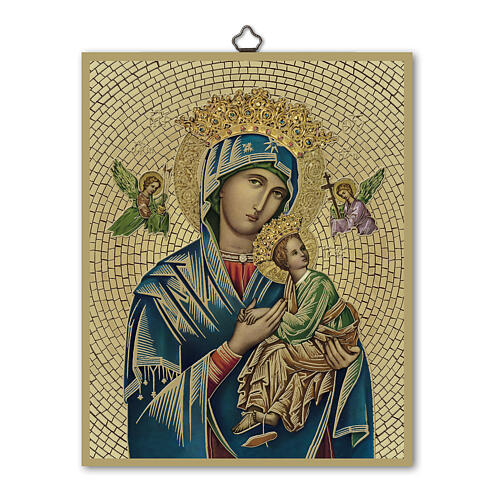 Diese hochwertige Ikone zeigt die Gottesmutter von der Immerwährenden Hilfe, umrahmt von einer goldfarbenen Leiste mit Mosaikoptik. Maria trägt ein tiefrotes Gewand und einen dunkelblauen Mantel. Das Jesuskind, in ein grünes Gewand gekleidet, wendet seinen Blick den Engeln zu, die zu beiden Seiten des Hauptes Mariens erscheinen – eine anrührende Darstellung göttlicher Nähe und Fürsorge.