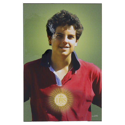 Rechteckiges Wandbild mit der Darstellung des heiligen Carlo Acutis auf Holzgrund, mit den Gesamtmaßen von 20 × 15 cm.