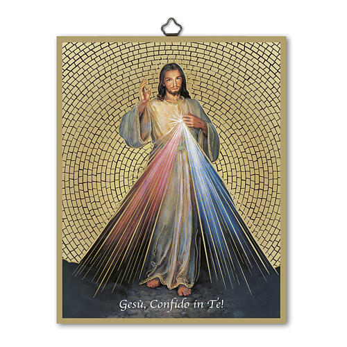 Dieses Wandbild zeigt Jesus den Barmherzigen in einer klassischen Darstellung, begleitet von der italienischen Inschrift „Gesù, confido in Te“ („Jesus, ich vertraue auf Dich“). Das Motiv ist von einer goldfarbenen Zierleiste eingefasst und vor einem Hintergrund in Mosaikoptik platziert, was dem Bild eine edle, warme Ausstrahlung verleiht.