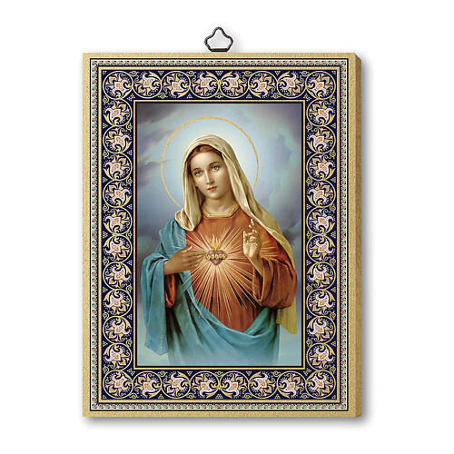 Holzbild mit der Darstellung des Unbefleckten Herzens Mariens. Der hochwertige Druck ist direkt auf das Holz aufgebracht.
