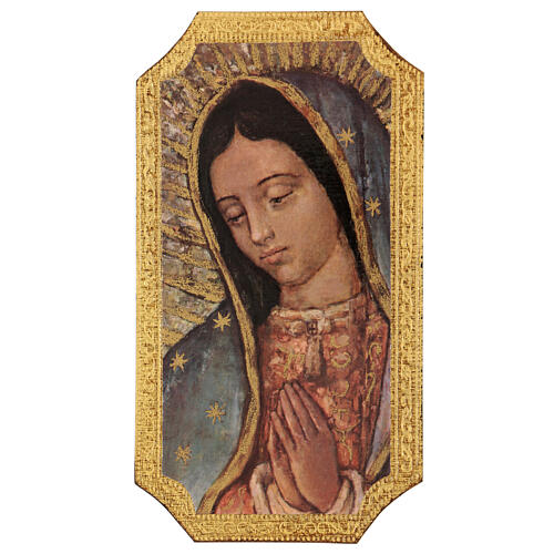 Konturgeschnittenes Wandbild aus Pappelholz mit der Darstellung Unserer Lieben Frau von Guadalupe.